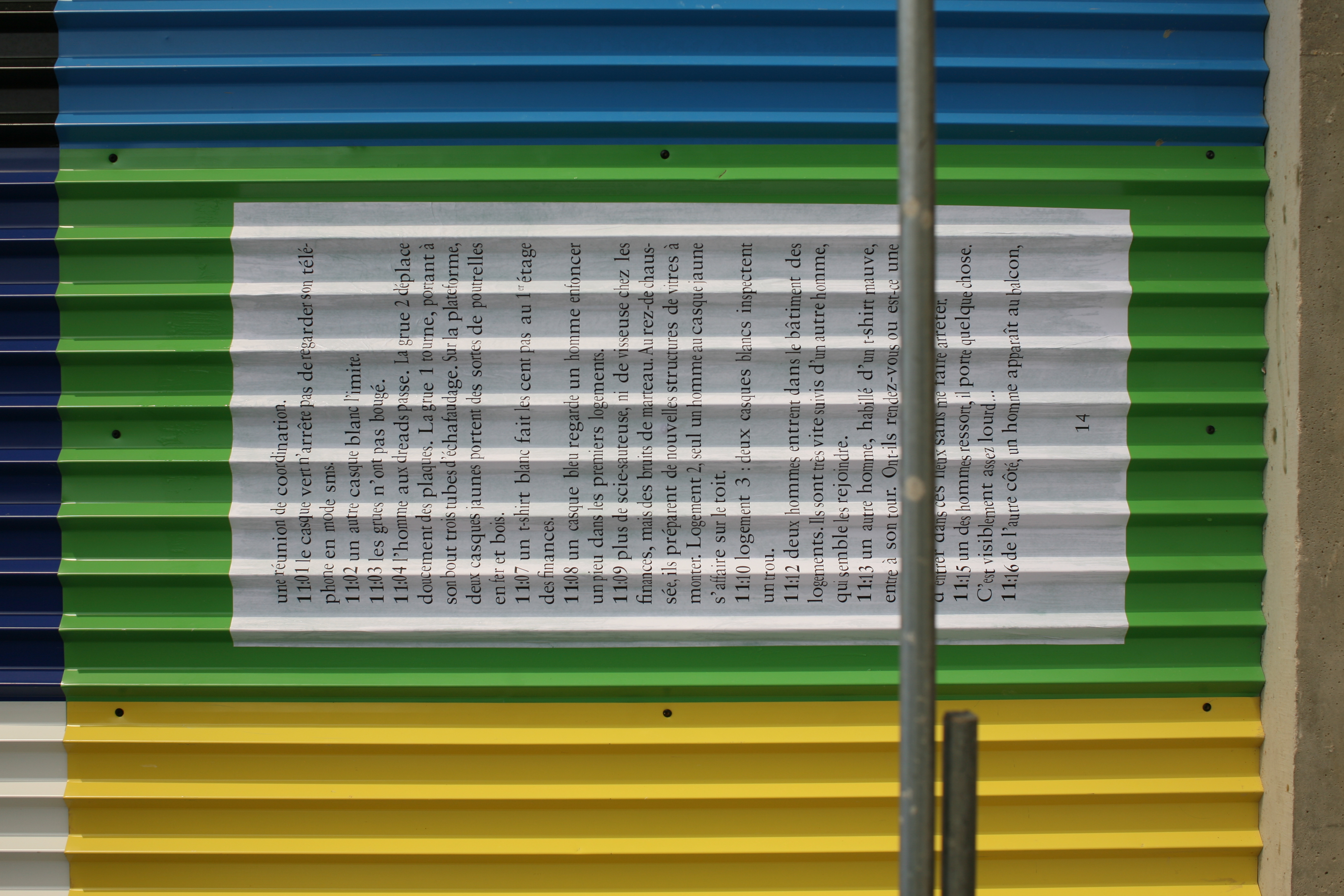 Cette résidence a donné lieu à un récit témoin sous la forme d’un livre de poche « pourquoi quelque chose plutôt que rien » et à un affichage d’extraits agrandis sur les palissades du chantier. Ce récit relate nos observations sur l’évolution du chantier de la ZAC d’Ivry. Pendant cinq jours, le lieu s’est transformé en tour de contrôle d’où chaque action est observée, chaque détail anodin a été minutieusement noté, laissant peu à peu place à la narration et à la projection personnelle de chacune.